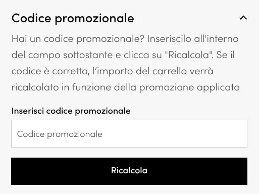 - Vai al carrello. In alto sulla destra della pagina, trovi la scritta “Codice promozionale”.