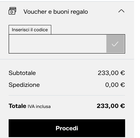 - Clicca su Voucher e buoni regalo e si apre un riquadro con la scritta Inserisci il codice.